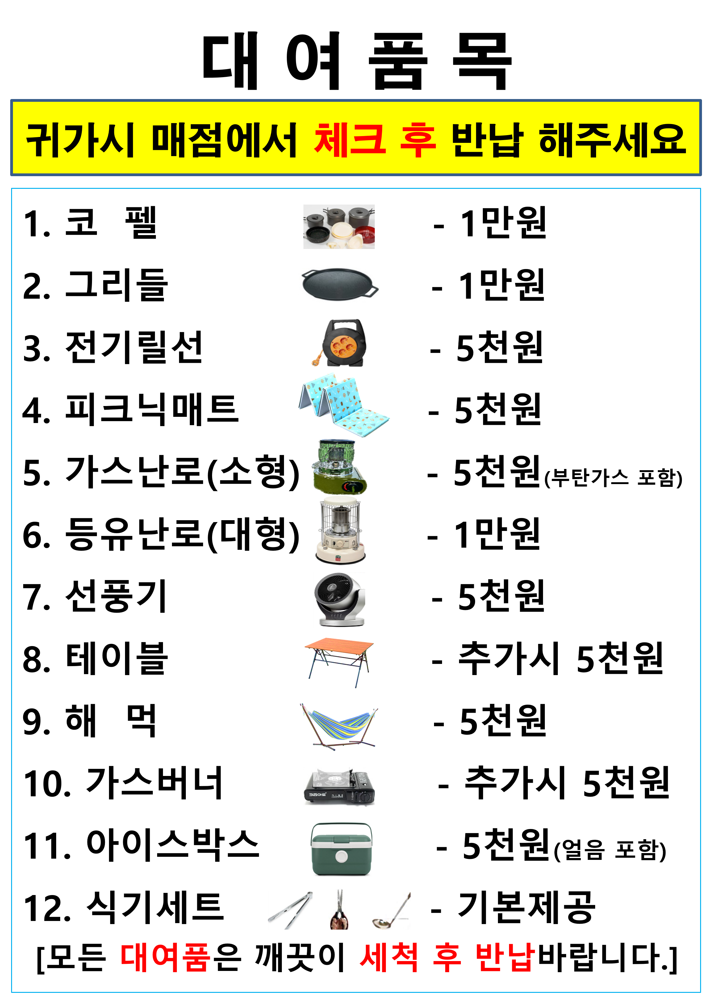 반납시 세척이 가능한 품목(코펠, 그리들, 식기세트 등)은 세척 후 반납해 주세요