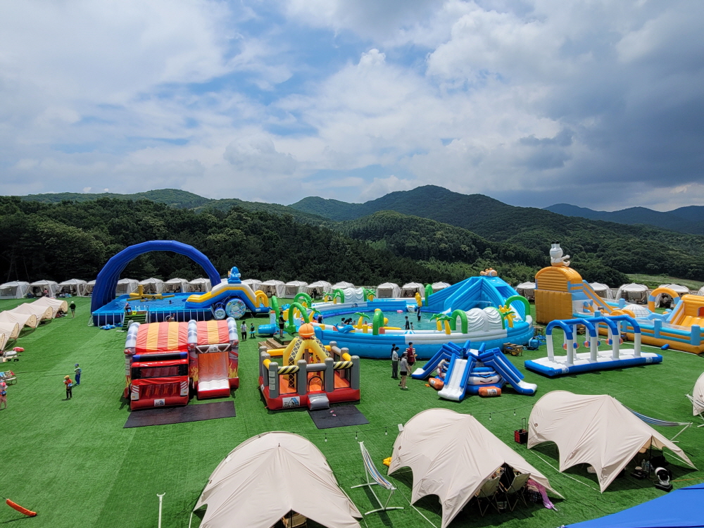 수영장 주변에는 다양한 에어바운스 놀이시설이 함께 배치되어 있습니다.